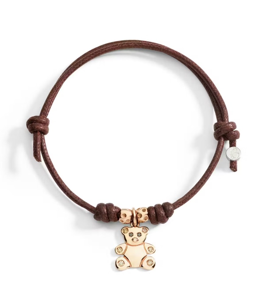 DoDo Kordelarmband braun dicke mit Anhänger Teddybär aus Rosegold 9kt, Emaille rot und schwarz, mit 6 braune Diamanten 0.10ct und 2 schwarze Diamanten 0.02ct und 2 granelli aus Rosegold 9kt. Silberner Verschluss mit Siegel. "Ewige Liebe". Alle mit der Kordel gefertigten Schmuckstücke gelten als personalisierte Sch