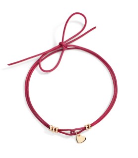 DoDo Kordel rot dünne mit 5 Komponenten Rondelle bold aus Silber vergoldet und Anhänger Herz aus Rosegold 9kt "Jeder Herzschlag ist wertvoll". Silberner Verschluss mit Siegel. Alle mit der Kordel gefertigten Schmuckstücke gelten als personalisierte Schmuckstücke und sind daher von der Rückgabe ausgeschlossen
