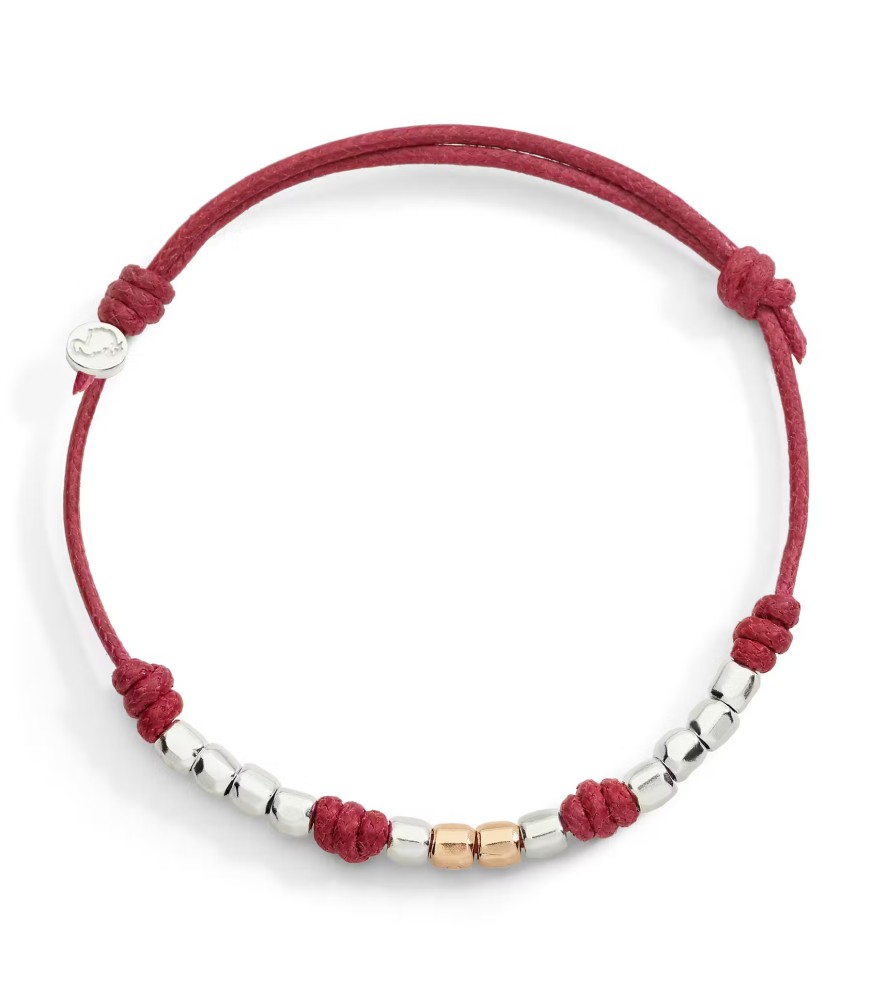 DoDo cord bracelet bordeaux thin with 10 silver mini granelli and 2 rose gold 9kt mini granelli. Silver clasp. All jewels composed with the cord are to be considered as personalized jewels, therefore not subject to return