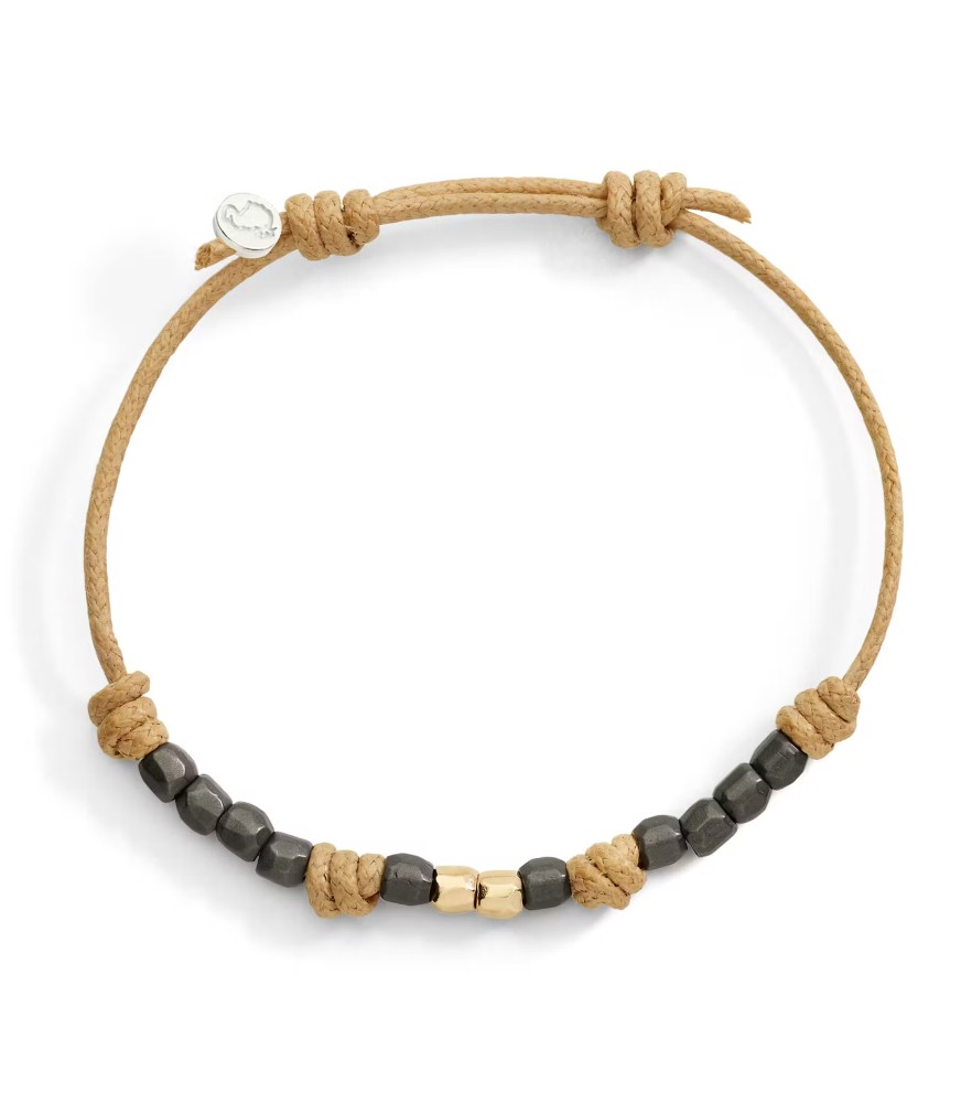 DoDo cord bracelet beige thin with 10 titan mini granelli and 2 yellow gold 9kt mini granelli. Silver clasp. All jewels composed with the cord are to be considered as personalized jewels, therefore not subject to return