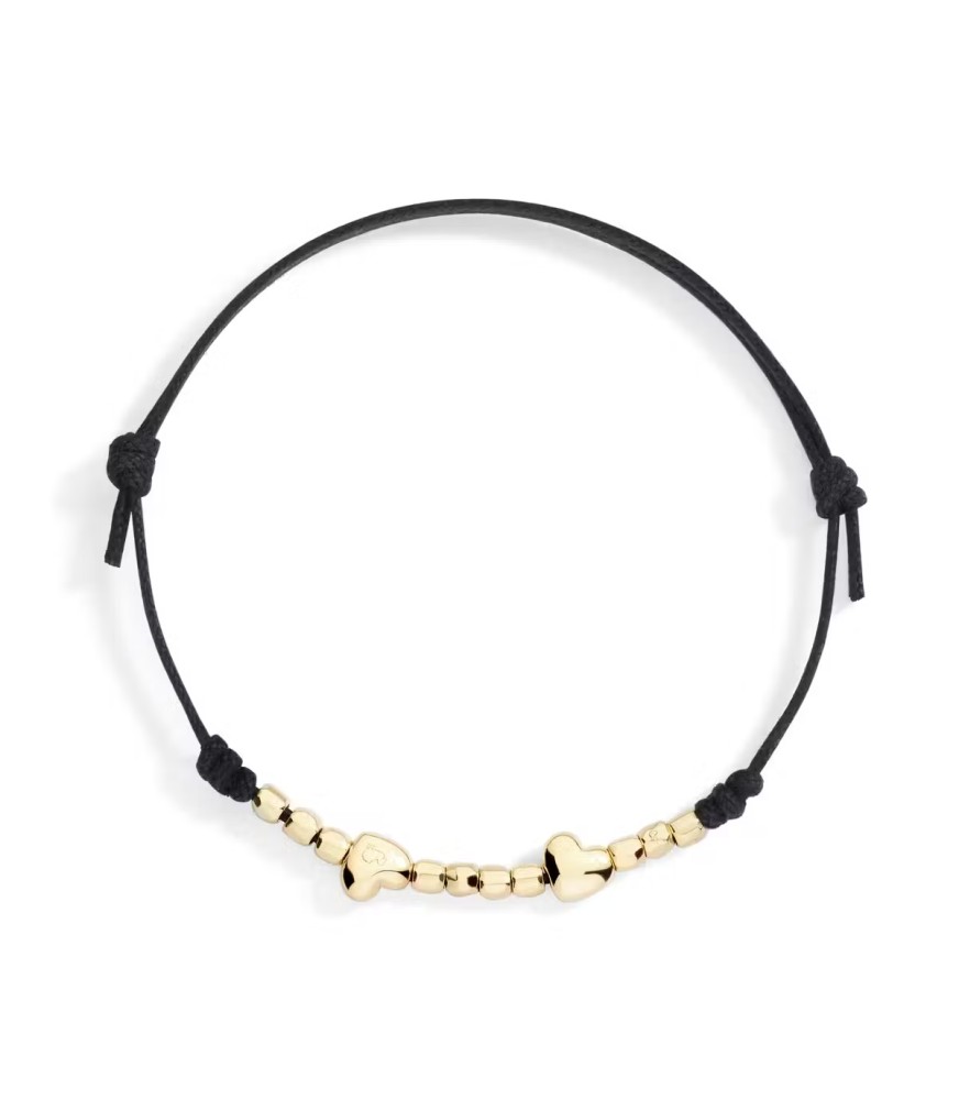 DoDo cord bracelet black thin with 2 heart in yellow gold 9kt and 10 components mini granelli in yellow gold 9kt. Silver clasp. All jewels composed with the cord are to be considered as personalized jewels, therefore not subject to return