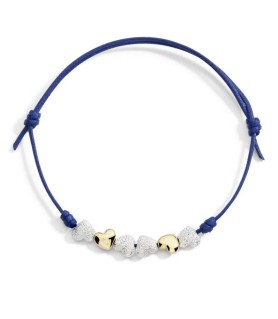 DoDo cord bracelet blue thin with 4 components heart in silver with diamond-cut finish and 2 components heart in yellow gold 9kt. Silver clasp.