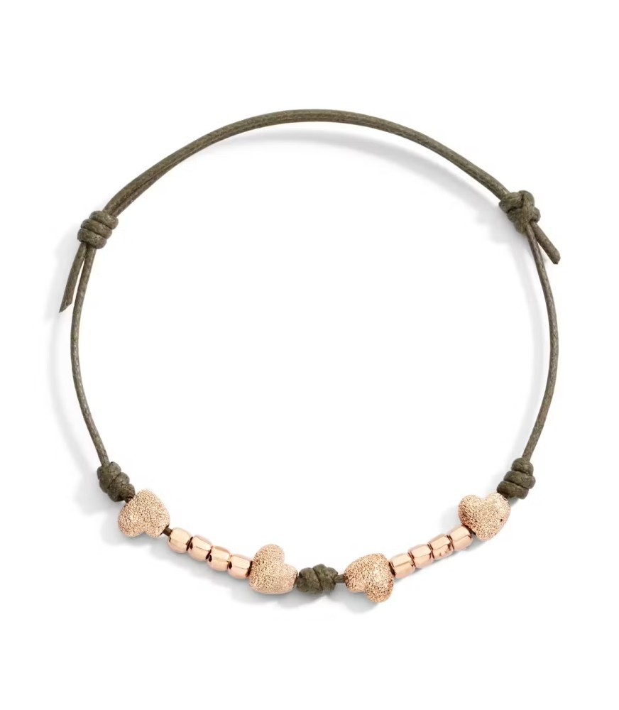 Bracciale DoDo cordino verde militare sottile con 4 componenti cuori in oro rosa 9kt effetto diamantato e 8 componenti mini granelli in oro rosa 9kt. Chiusura con sigillo in argento.