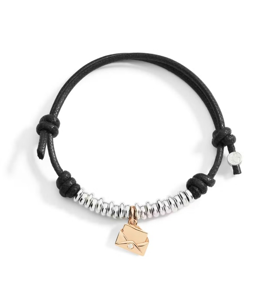 Bracciale DoDo cordino nero spesso con ciondolo lettera in oro rosa 9kt con 1 diamante bianco 0.02ct e con 20 rondelle in argento. Chiusura con sigillo in argento. "Un messaggio per te". Tutti i gioielli composti con il cordino sono da intendersi come gioielli personalizzati, quindi non soggetti a reso